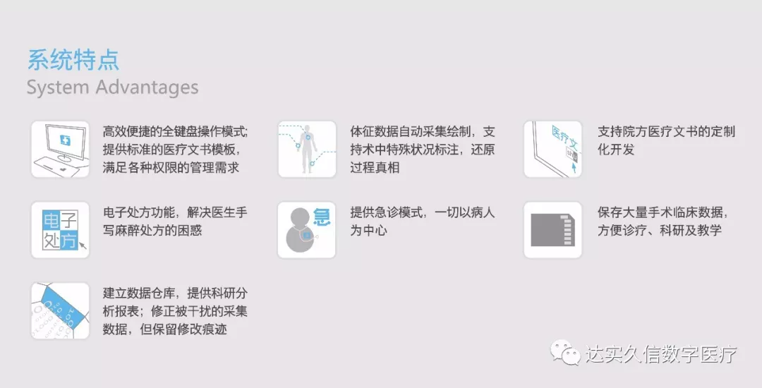 該係統用於醫院手術、麻醉科室對手術病人在圍術期手術和麻醉信息的記錄和管理;係統對整個手術及麻醉流程實現信息化管理,促進醫院手術、麻醉管理合理、有效、安全地運行,並留下完整的手術記錄、全程跟蹤、記錄手術的申請(預約)、審批、手術室和麻醉科對手術進行安排、術後隨訪和管理等相關信息,完成手術涉及的所有臨床診療記錄和流程。